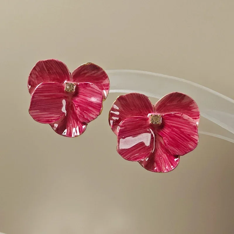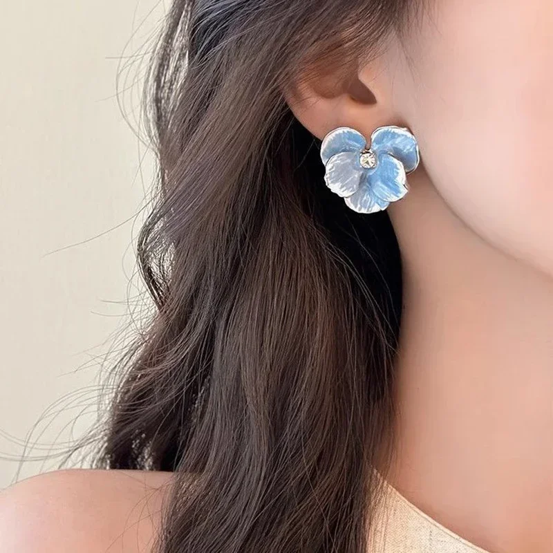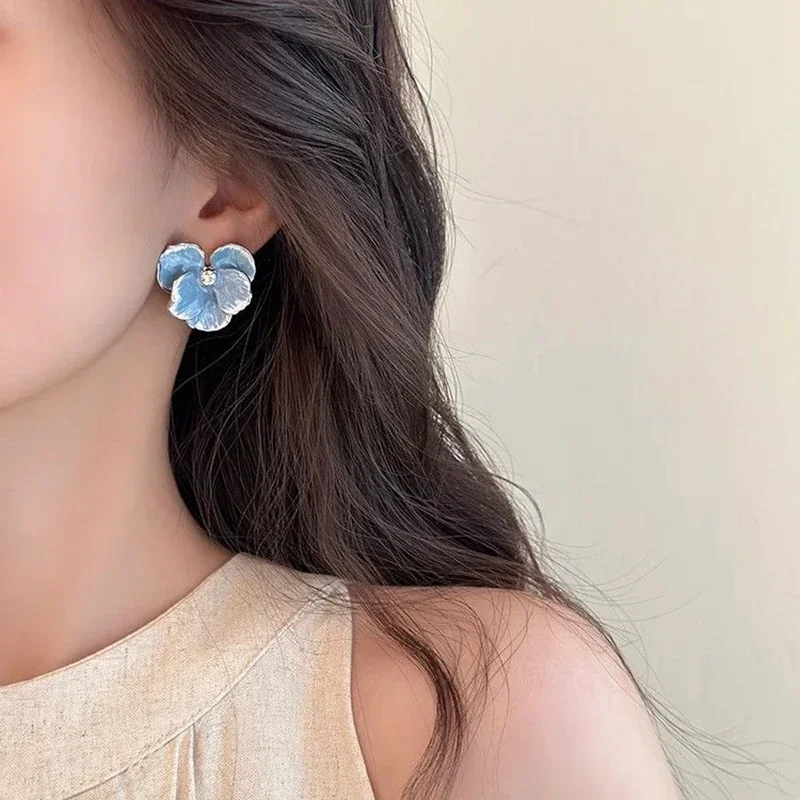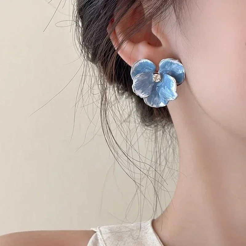 Luckacco Retro Big Flower Stud Earrings Red Blue Enamel Oil Petal Rhinestones Earrings for Women Wedding Party Cute Elegant Jewelry Gift